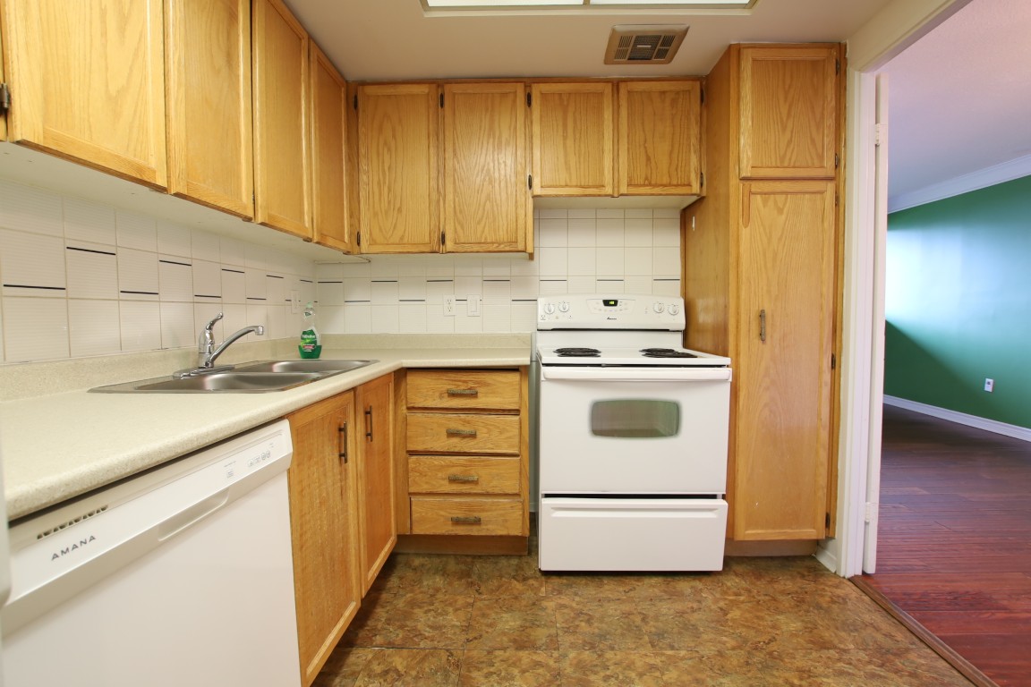 Kitchen has ample cabinet space, a tile backsplash, double sink, and a passthrough window to the dining room..