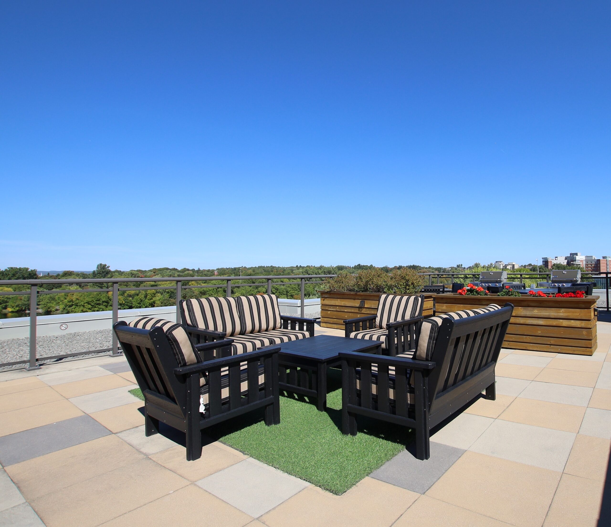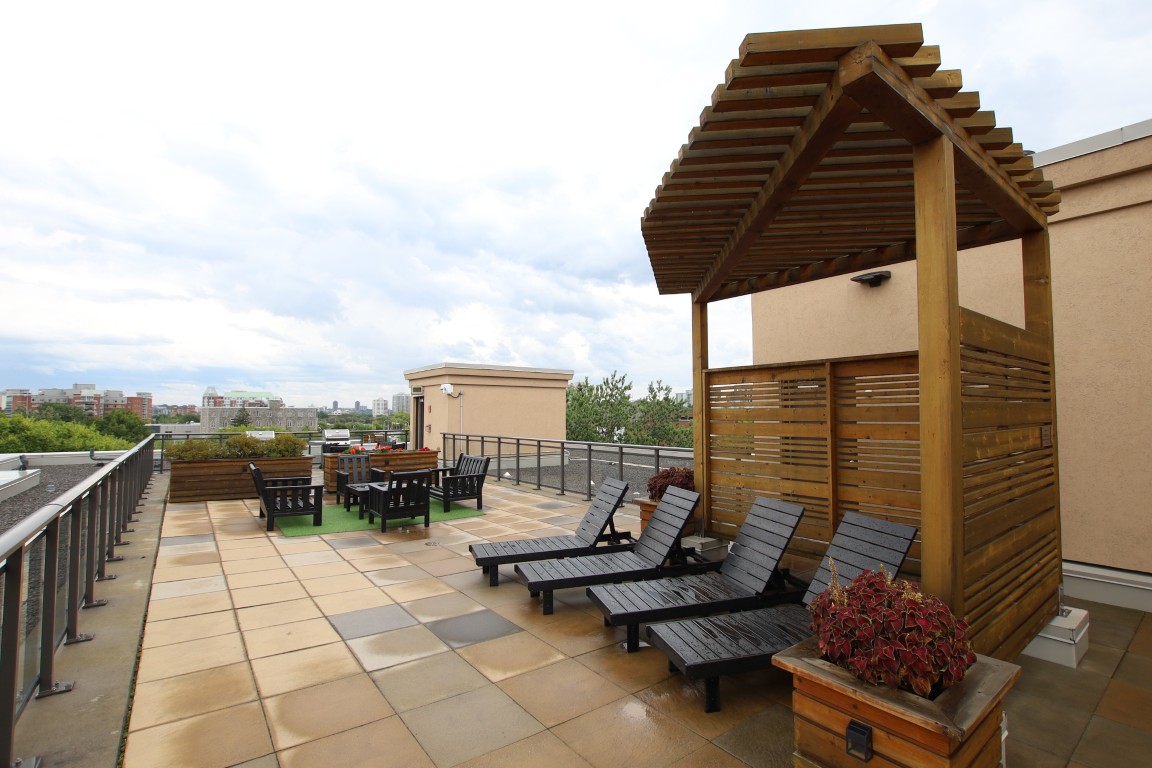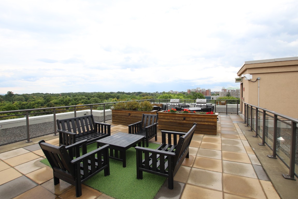 Building amenities include a gym, party room, visitor parking (6 spots), available bike storage, available watercraft storage (free until 2026), and a large rooftop terrace with sunchairs, tables, BBQs, and a stunning view of Gatineau Hills and Rideau River.