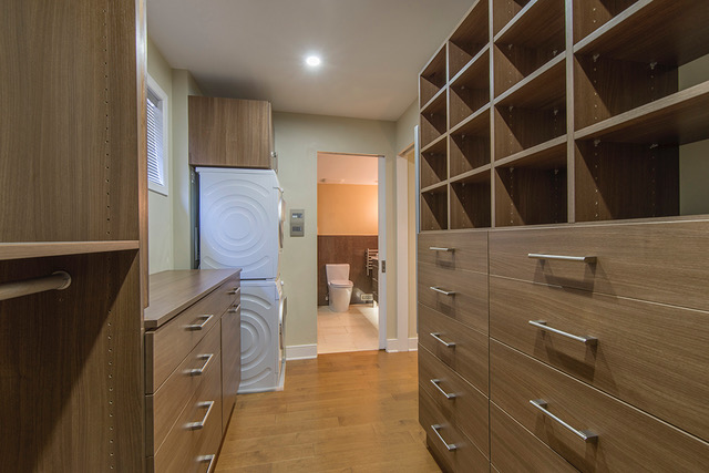 The primary bedroom features a spacious, spa-like ensuite with a jacuzzi tub, walk-in shower, quartz vanity with double sinks, underfloor heated tiles, and built-in wireless speakers. The primary bedroom also includes a massive walk-in California Closet with built-in shelving and drawers, which houses a Bosch washer and dryer as well as a built-in ironing station.