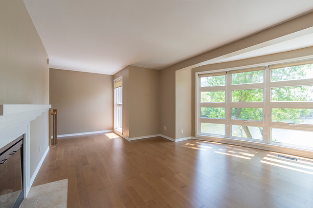 The second floor features a large, bright living room with floor-to-ceiling windows showcasing beautiful views of the Rideau River, along with a decorative art deco fireplace (decorative only). Both bedrooms and a full bathroom are also located on this level.