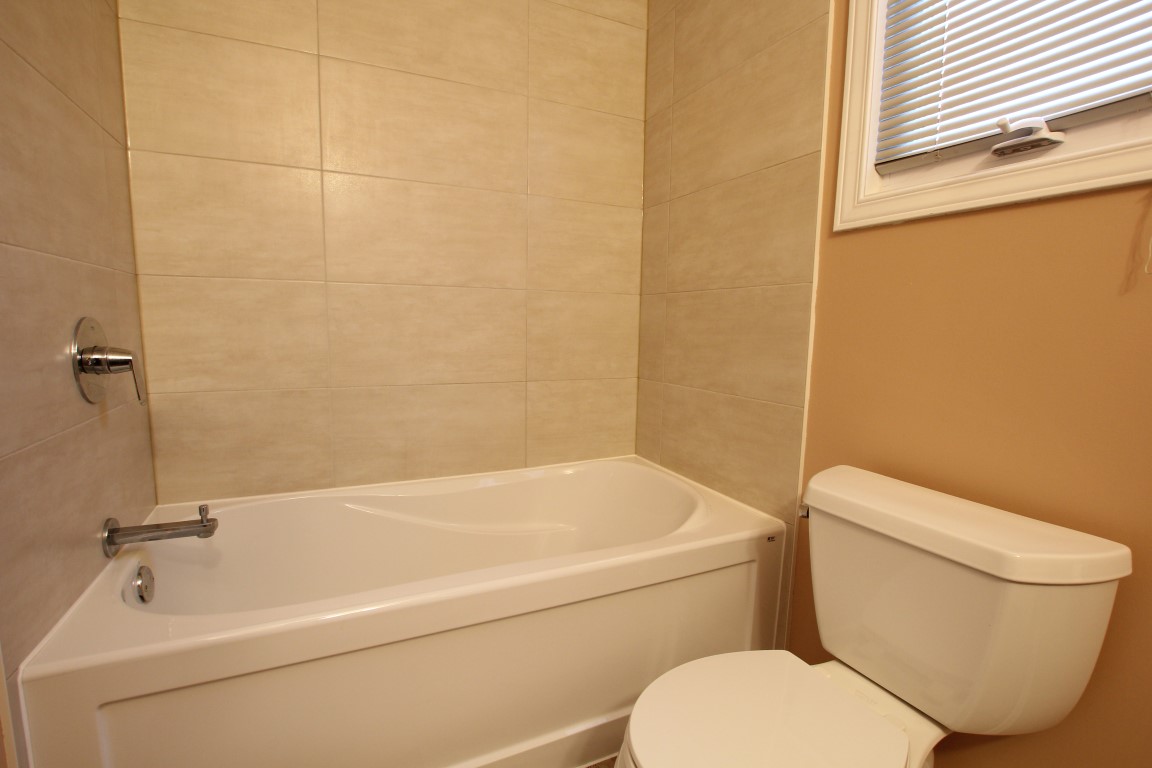 Additional full upstairs guest bathroom has ceramic tile flooring and a shower/tub with tiled walls.