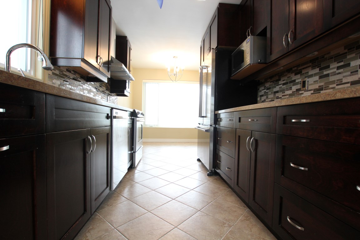 Kitchen features ceramic tile flooring, attractive countertops, modern dark brown cabinets, tile backsplash, double sink.