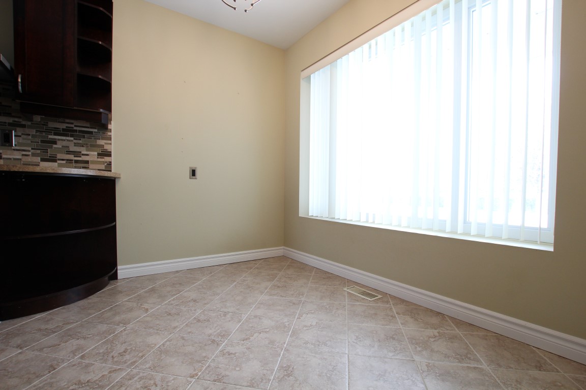 Adjacent kitchen eating area also has ceramic tile flooring and receives ample natural light from the large front window.