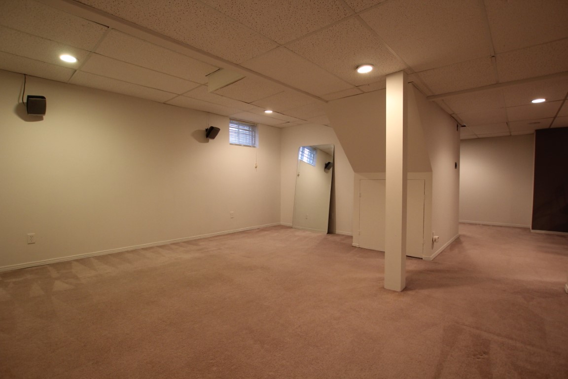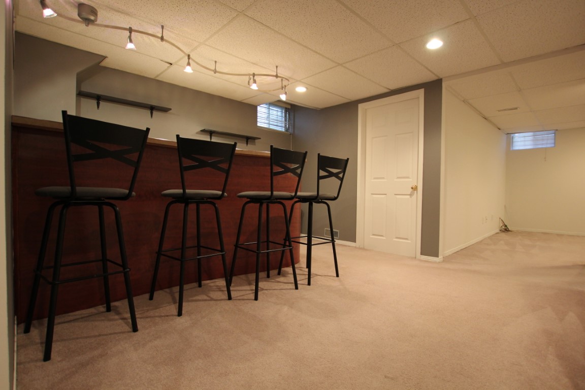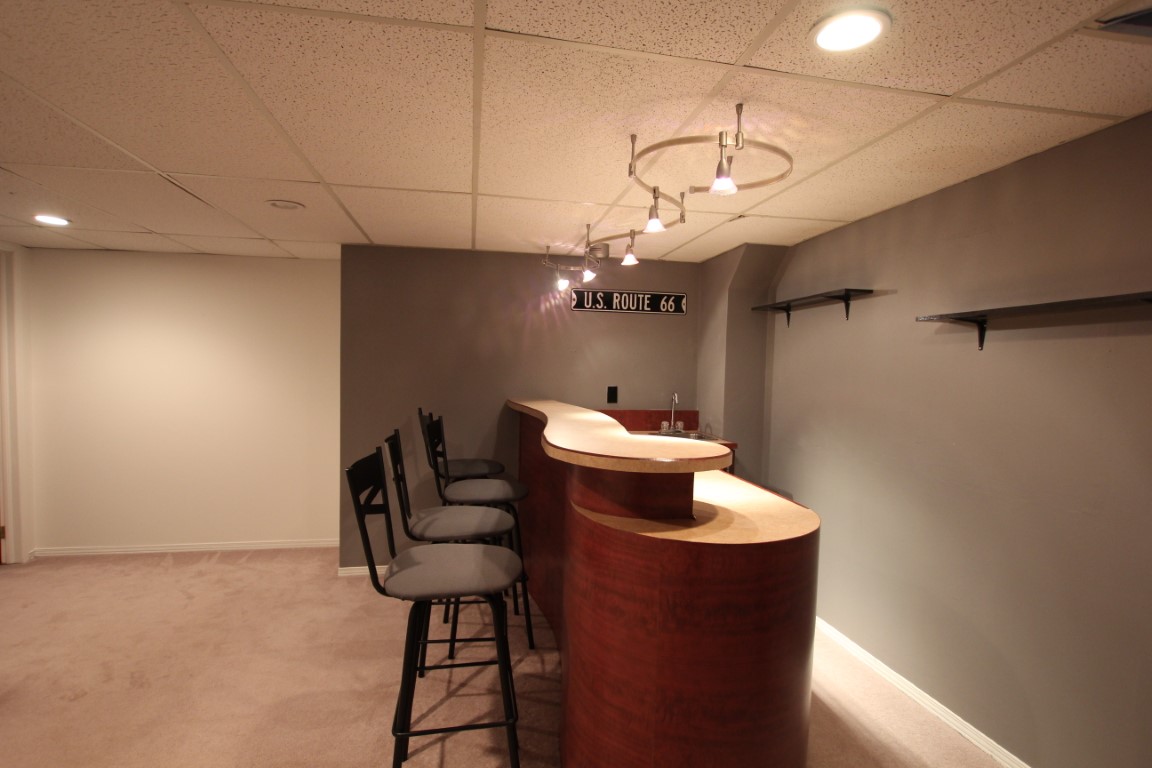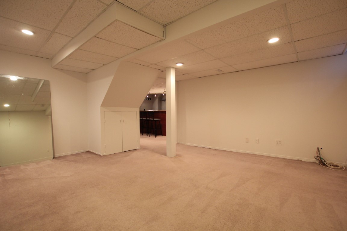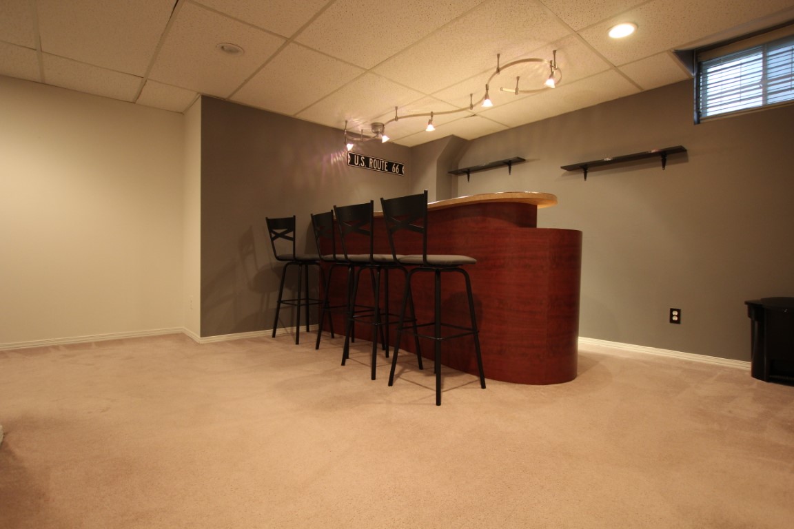 Large, finished basement rec room has quality carpeting and a functional/attractive wet bar.